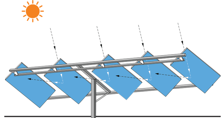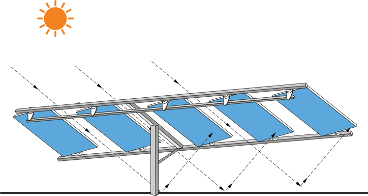 For bifacial use, panel array design of most trackers catches only residual solar radiation bouncing off the ground.