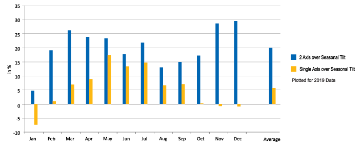 Performance of Horizontal Mount Single Axis Trackers is known to fall significantly during winter months, because while the modules are still moving East to West during the day but the Sun’s path has changed along the North-South axis, thus the angle of incidence is nowhere near normal as intended.