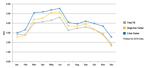 Data collected for three types of installations at the same location in Uttarakhand, shows consistently higher performance of the Asun 2 Axis Tracker.